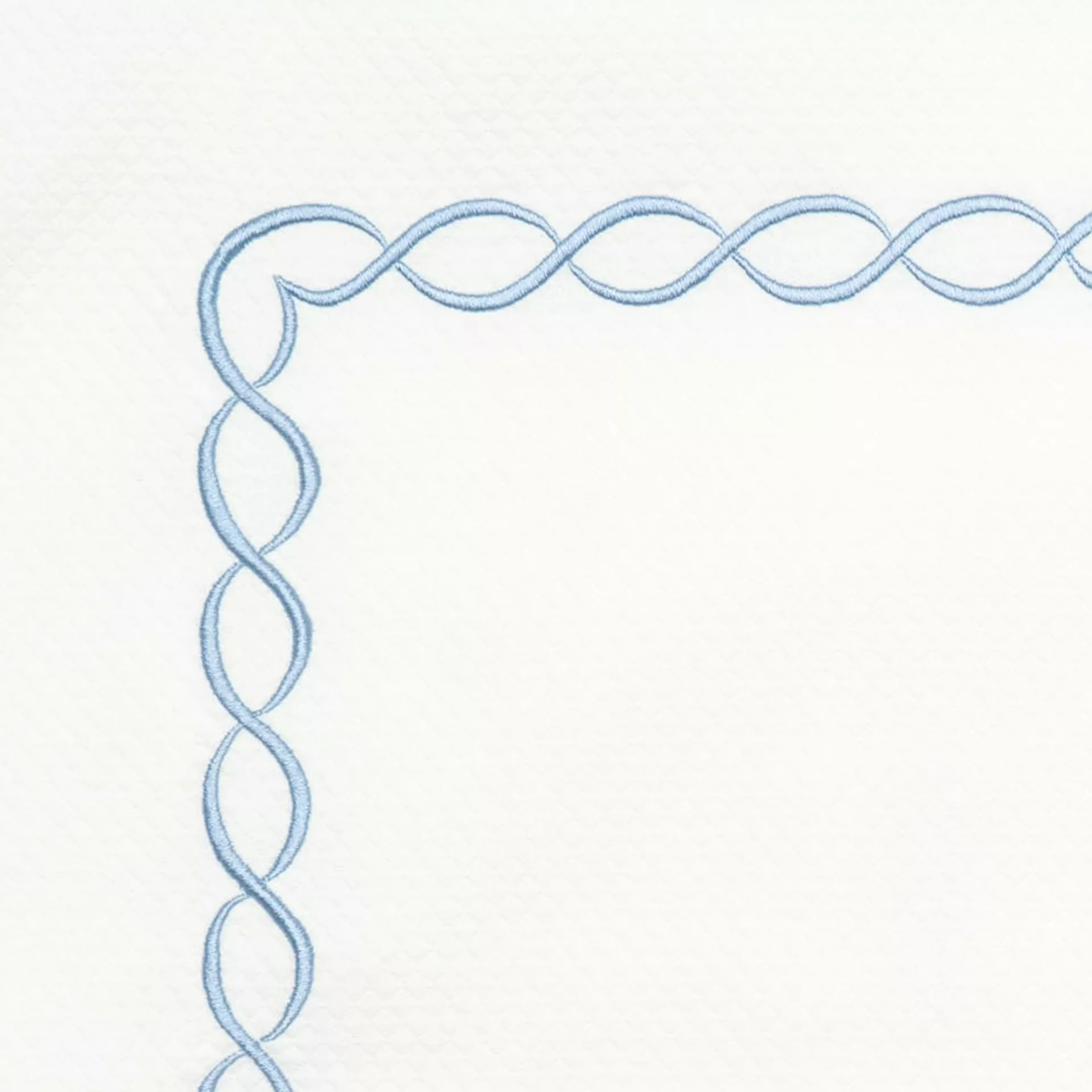 A classic embroidered style with a unique approach to the corner treatment that can stand out or blend in based on the thread color you select for your piece.