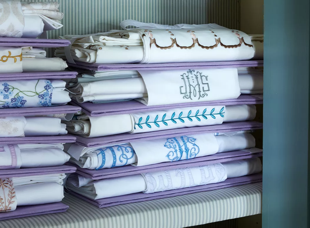 Linens should be stored clean and thoroughly dried in a cool, dry space protected from sunlight. If storing in containers, breathable options like cotton bags or acid-free tissue are recommended. Avoid plastic containers or bags, which can trap humidity. Starch should be avoided for long-term storage since it can cause yellowing, but for linens cleaned and rotated regularly, starching and pressing before storage is not problematic. Keeping an organized linen closet helps ensure linens are used regularly and maintain their freshness - for that reason we recommend storing on linen boards with the decorative hem of the pillowcase used to wrap and identify the set.