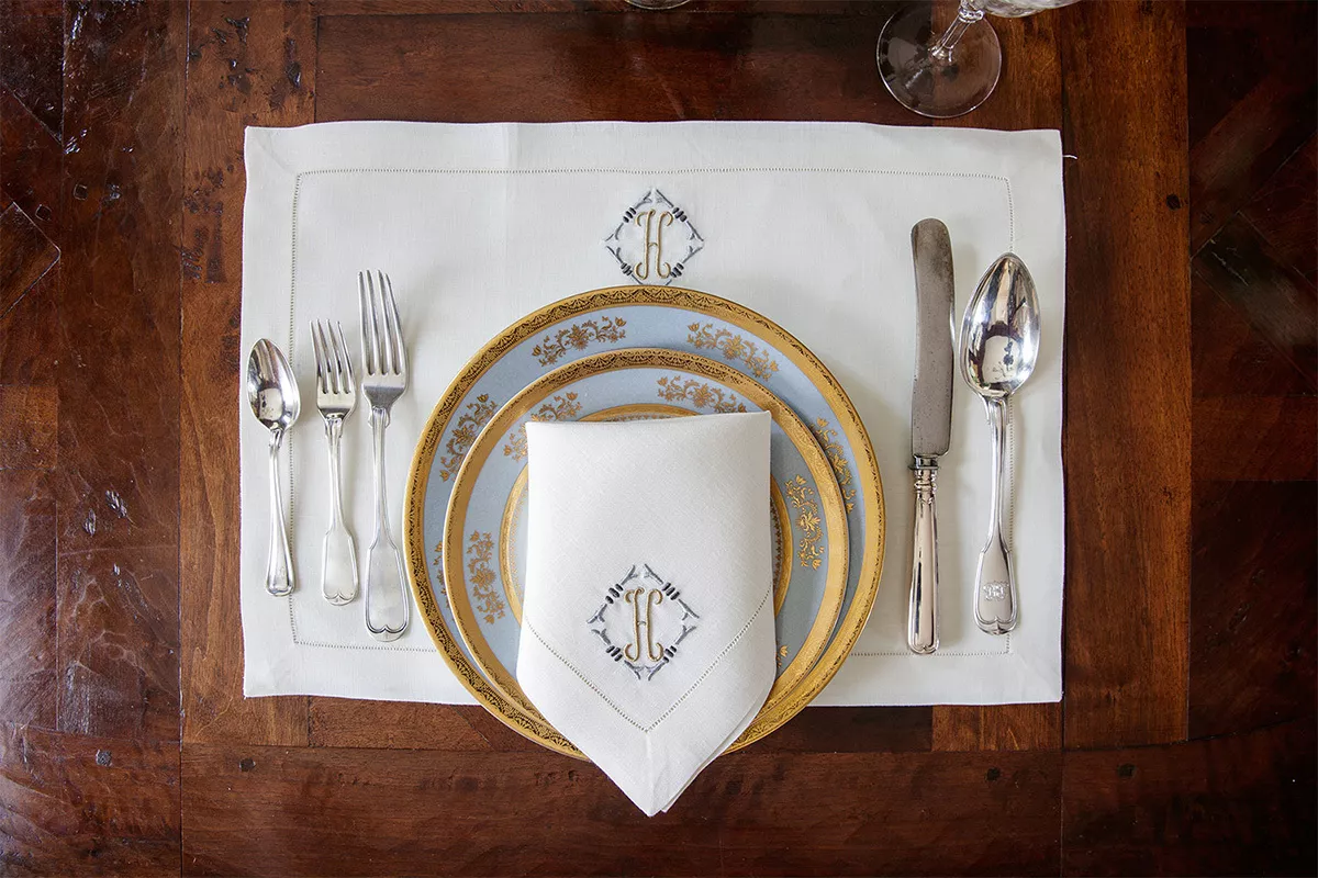 Leontine's most popular placemat size is a 15" square mat, ideal for entertaining because it perfectly frames the china and it allows for seating guests more closely together, in order to fit more people at a table. We also offer a 14x20 rectangular mat (seen below) and a 15" round mat.