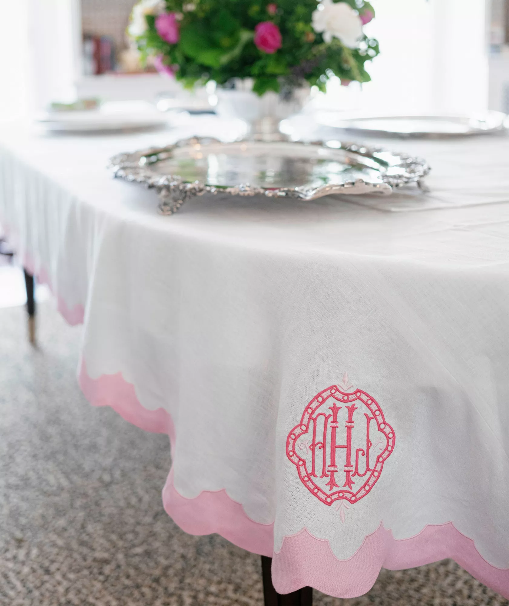 A round table cloth with Nancy and Grace Cuff applique borders