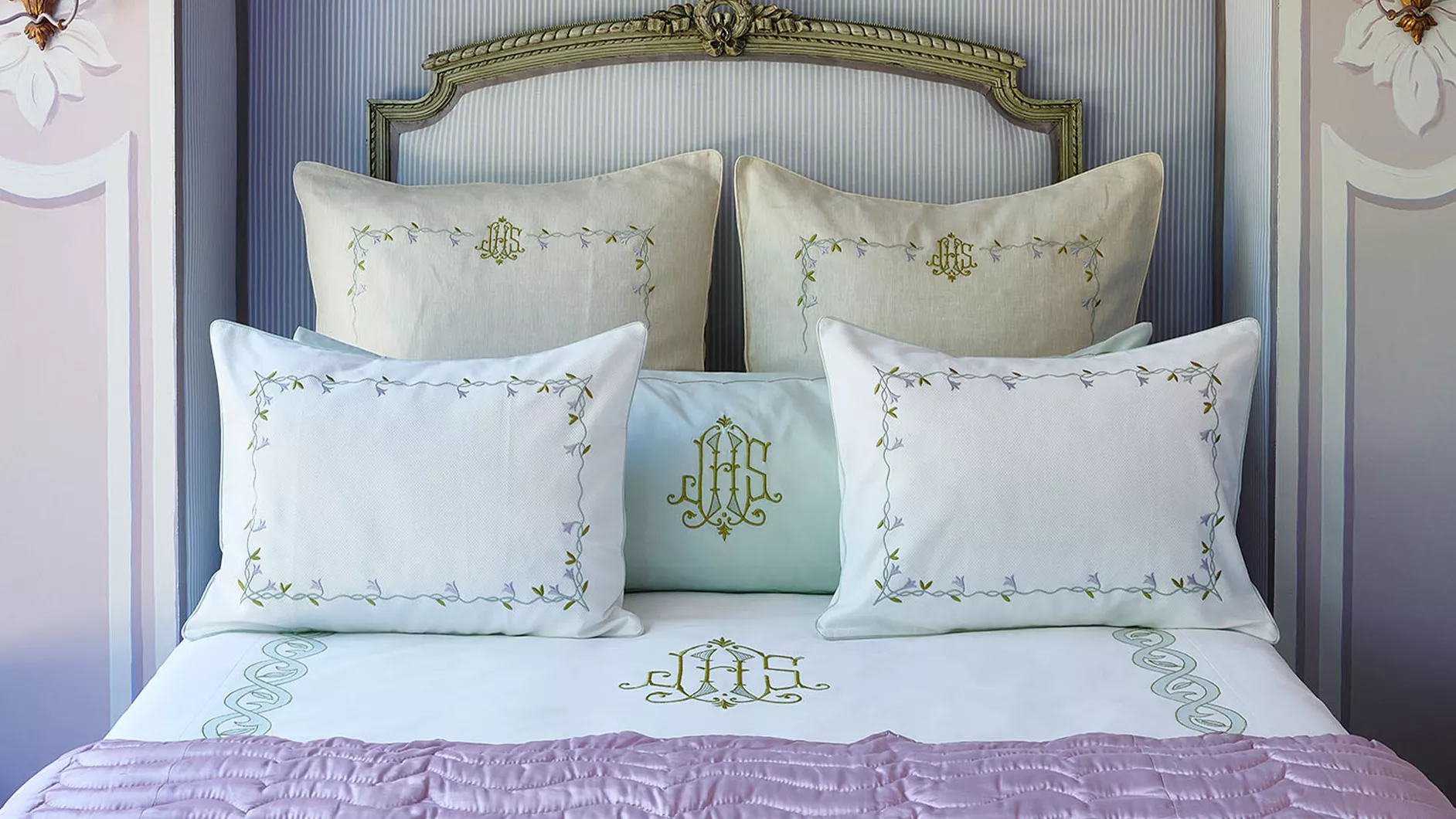 Jane Scott chose a soft, botanical theme for the embroidery and applique elements of this bed set. The Etienne monogram, a classic Leontine Linens look, features on the super-euros, body pillow, and blanket cover. Its soft green seeding echoes the Desert green of the body pillow.