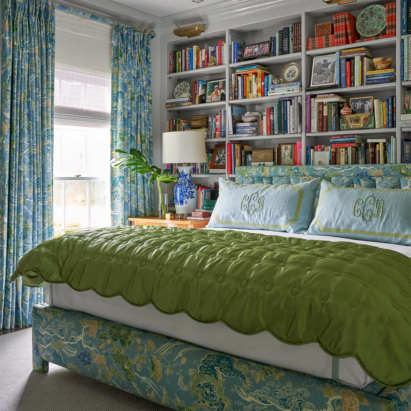 In her University Park home, designer Cynthia Collins embraced a playful and feminine aesthetic, incorporating vibrant colors and patterns throughout. The primary bedroom features our Buttons quilt and a King shams adorned with the Alexa monogram and Arch border, complementing the room's romantic and layered design.