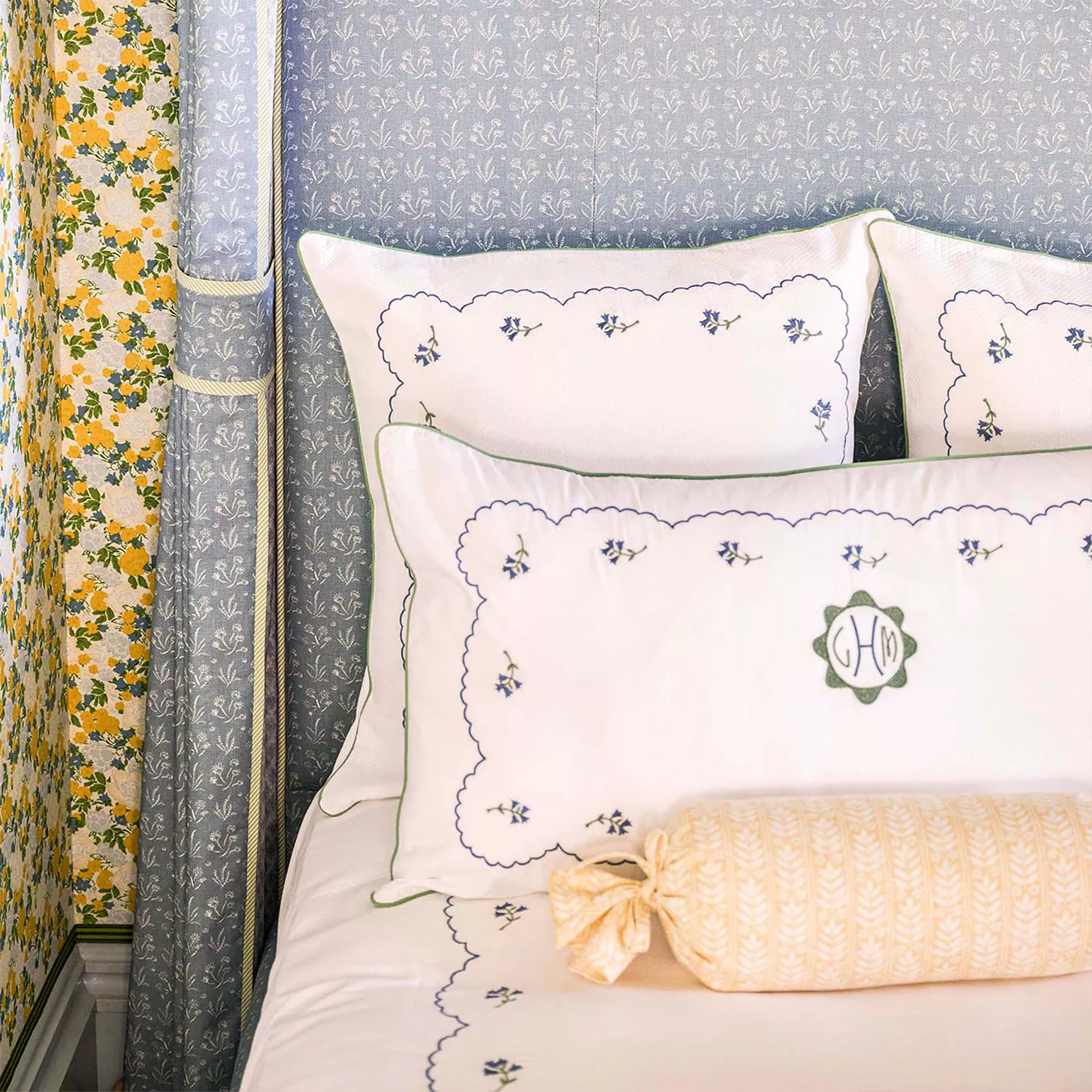 Interior designer Lisa Henderson transformed a compact guest room in the 2024 Kips Bay Decorator Show House Dallas into a whimsical, English garden-inspired retreat. The space features custom linens with our Lily border on the Euros and duvet, and our Cornelia monogram on the king shams, perfectly complementing the room’s fresh, cheerful design.