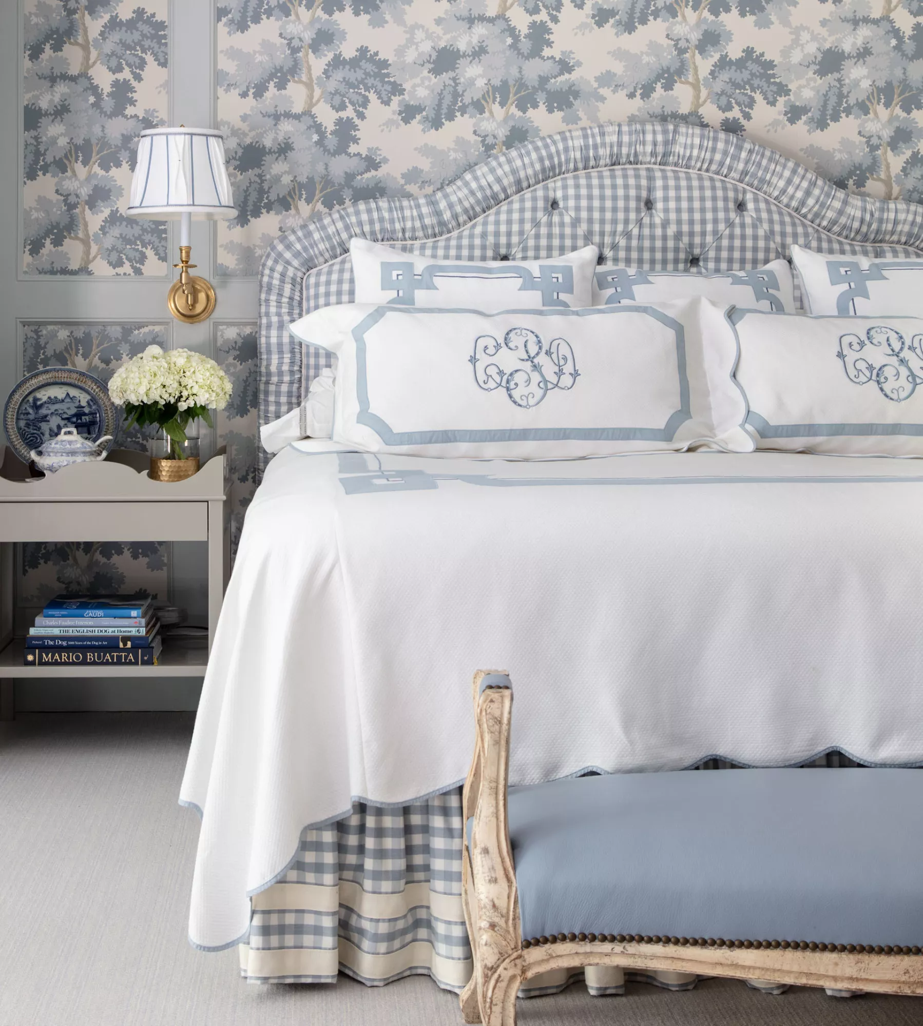 In this beautiful master bedroom, designer Nicole Zarr masterfully combines the Addison monogram with two different borders - Arch and Gwen - for a sublime combination in the perfect shade of blue to complement the décor.