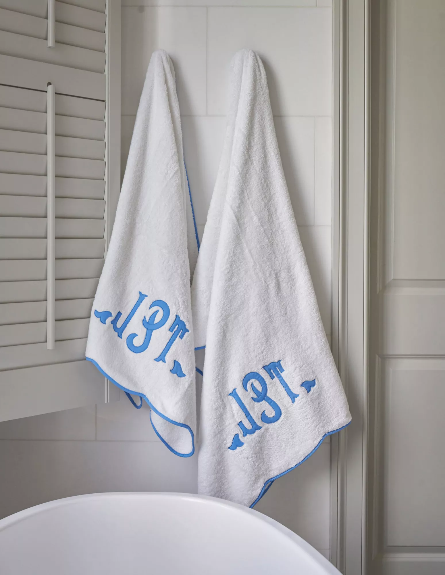 On the right bath hook sits a coordinating bath sheet. Like its partner, the scalloped edge and Alexis monogram are both fashioned in matching blue poplin.
