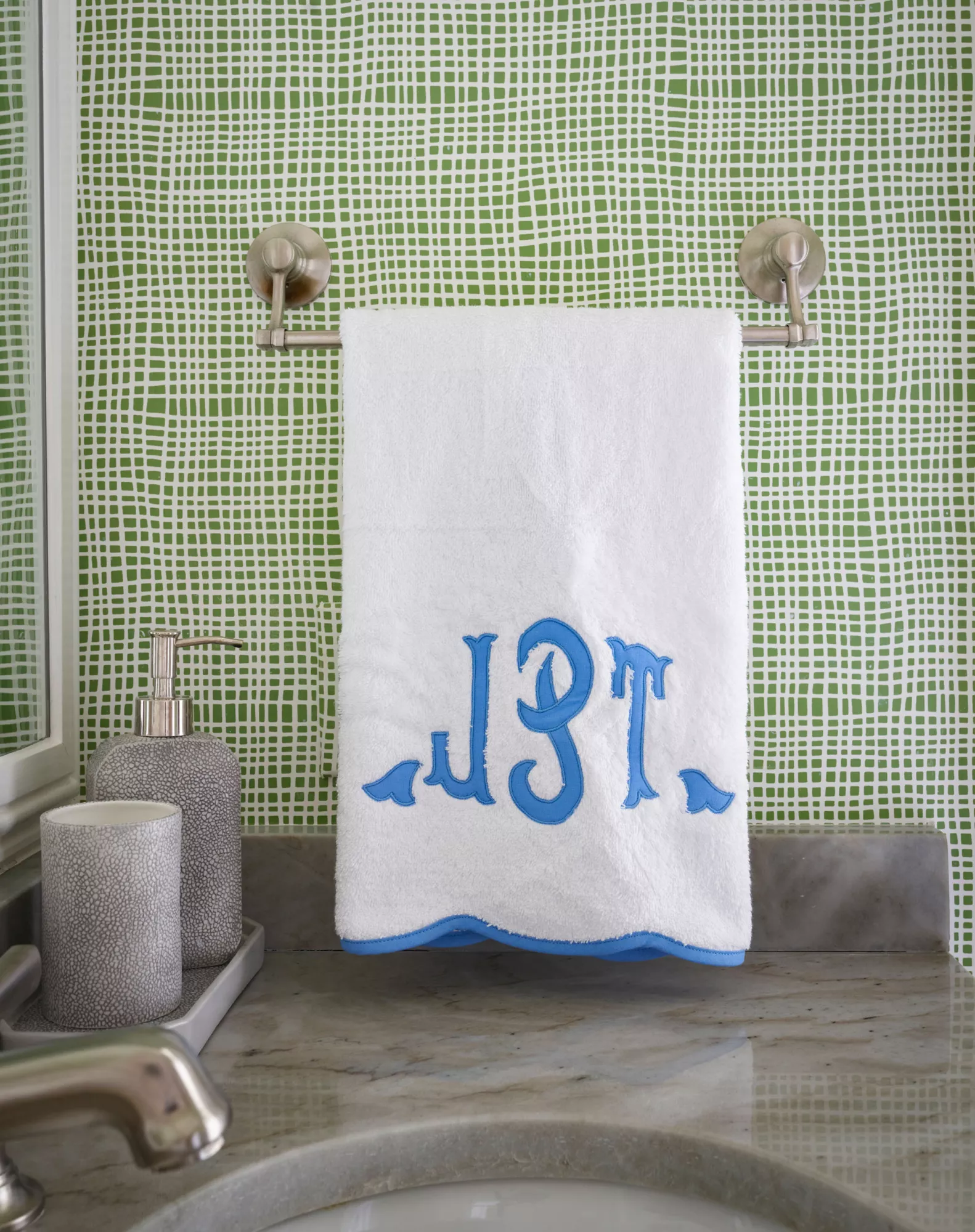 To stand out against the green woven wallpaper, the hand towel has been monogrammed and bound with bright blue poplin.