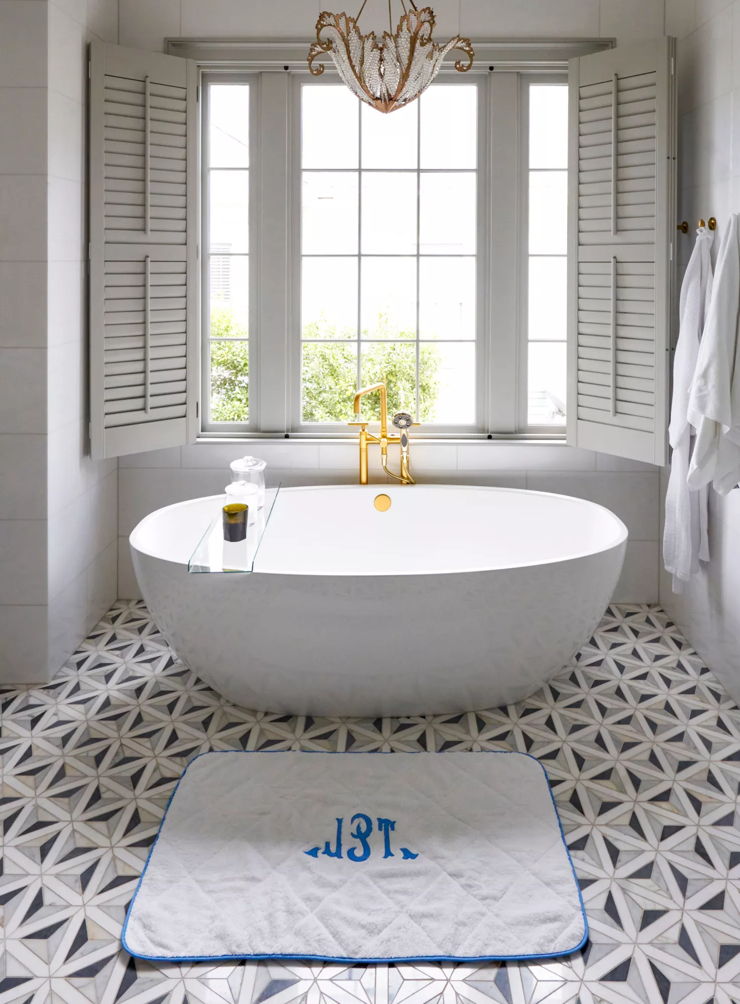This open soaking tub area is a neutral delight accented by golds. The quilted mat is trimmed in a pop of cornflower blue with applique monogram to match.