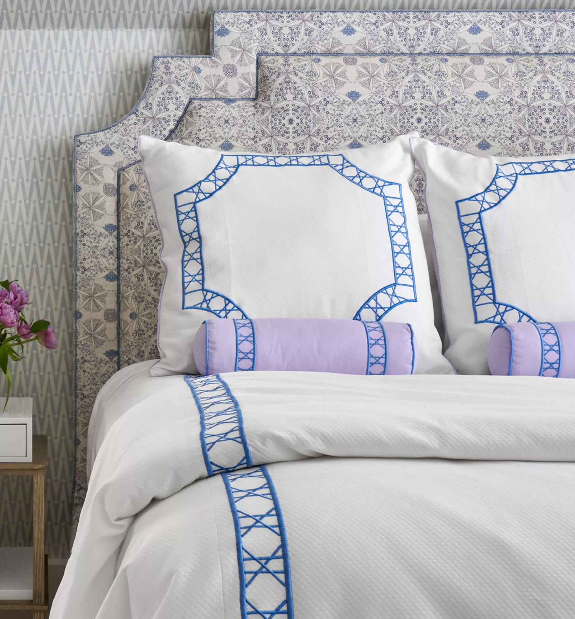 Three embroidered Euro shams sit against the patterned headboard. To marry the upholstery with the bedding pieces, navy thread was used to stitch the arched Cane border while lavender poplin graces the piping around each Euro sham.