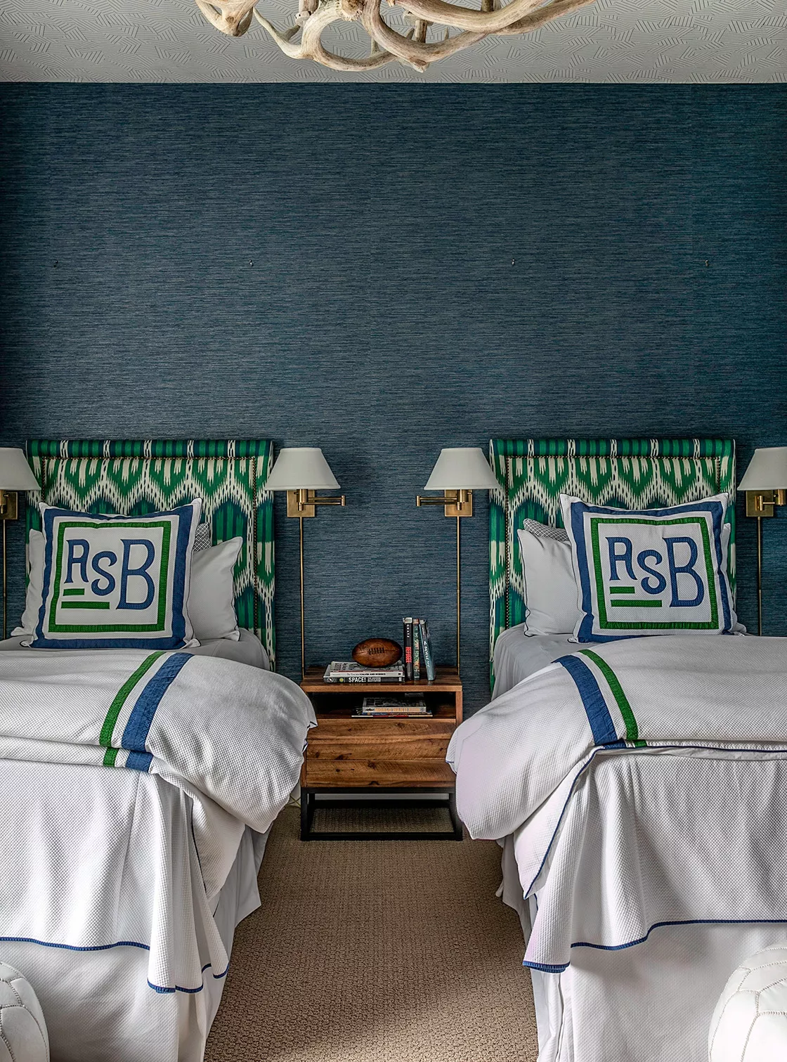 Interior designer Jennifer Martinez adds jewel-toned charm in this twin bedroom by mixing textures and patterns from the floor to the ceiling. To bring the boys' bedroom together, matching bedding sets are added in coordinating blues and greens, featuring the Christopher monogram and double banding.