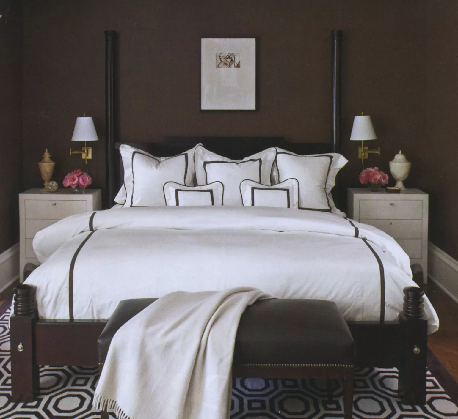 This set of bedding features the classic Leontine style of 1" bands framing the various elements, from the Euro shams to the duvet cover. Designer Tom Stringer coordinated the poplin bands and binding along the edge of the pieces with the rich shades of brown found throughout the bedroom.