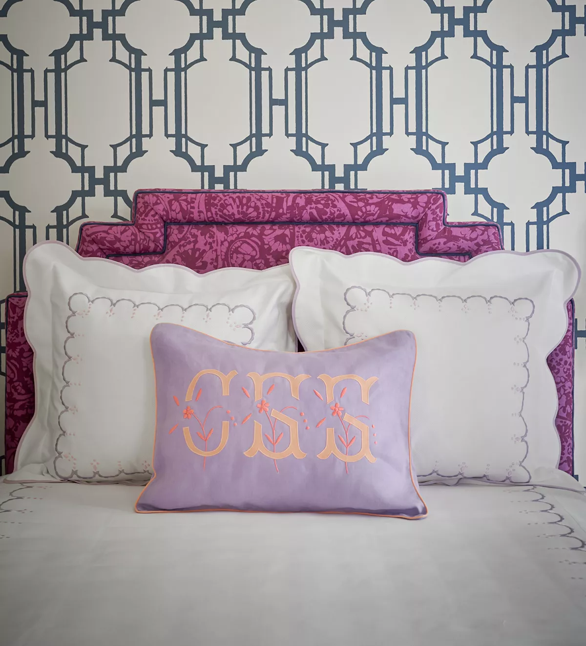 A pair of pique Euro shams sit against the headboard with lavender scalloped edges. Mirroring the scalloped flange is the delicate embroidery of the Lisette border, which has been stitched in two colors to complement the monogrammed standard sham.