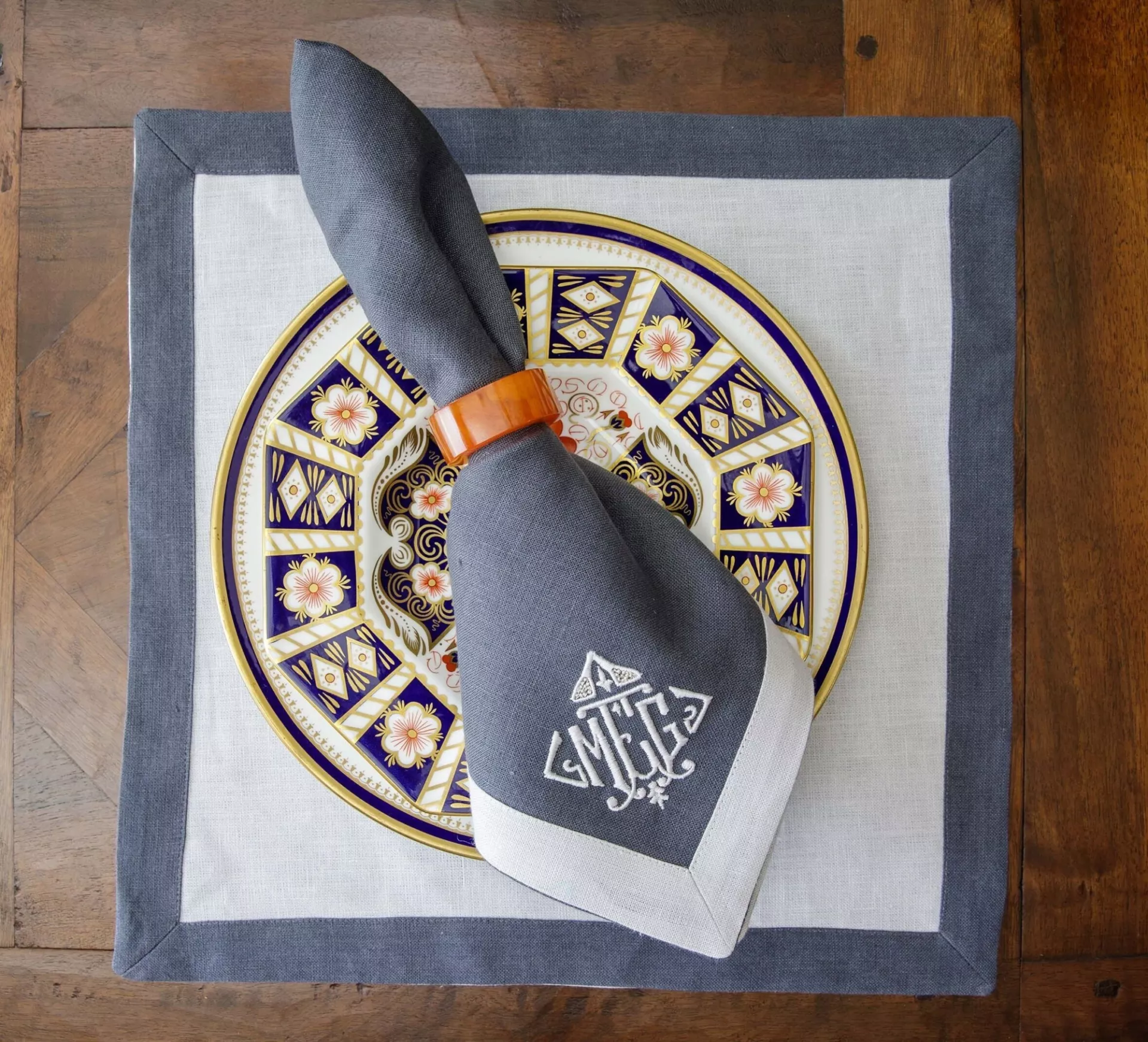 This placemat and napkin set features inverse monochromatic linen colors allowing the 1" cuff to provide the perfect amount of accent to offset the pieces from the table and plate. The monogram has been stitched in coordinating thread, adding a touch of personalization.