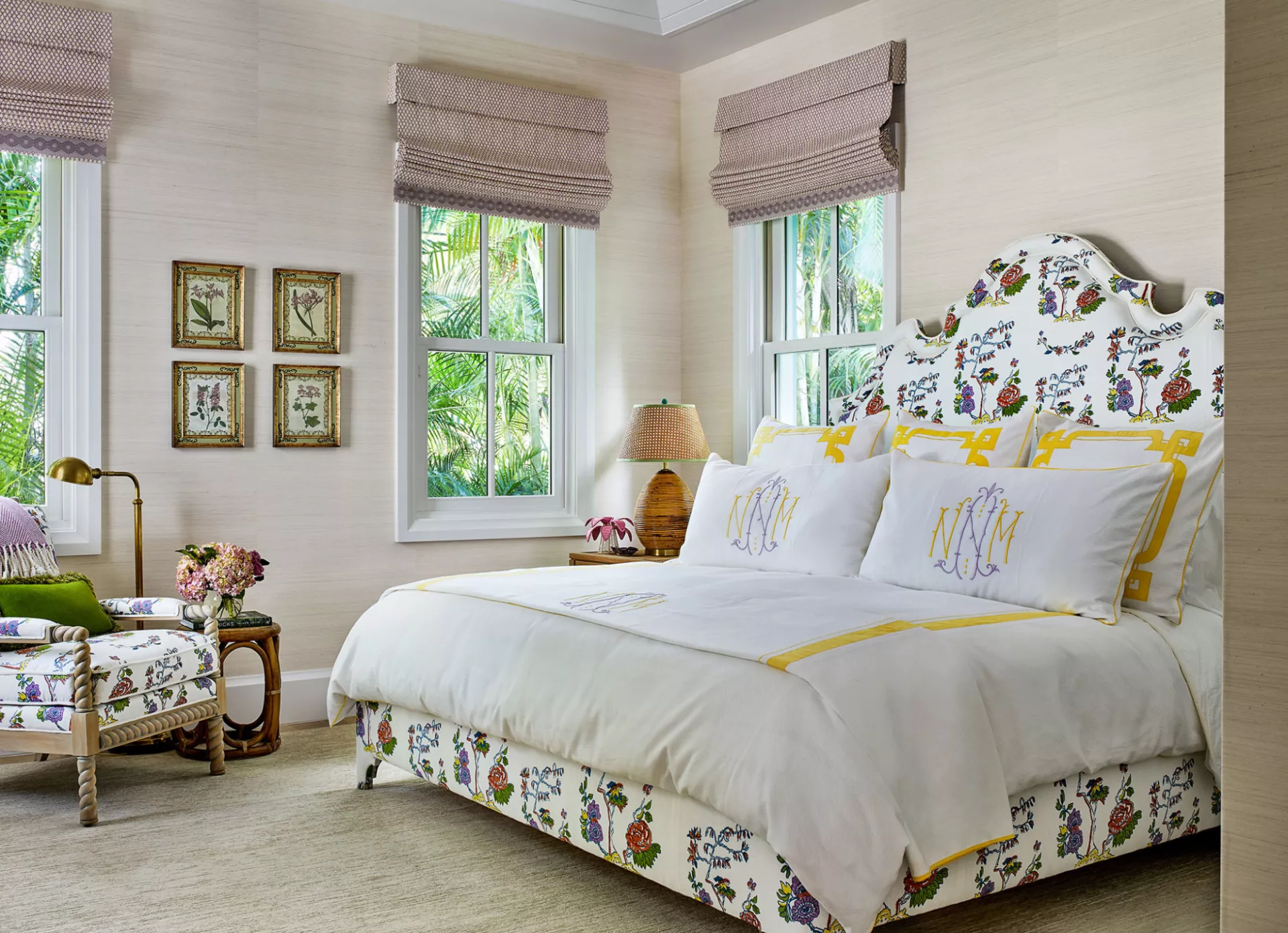 Maryland-based design duo Johnson Sokol pulled bright shades of yellow and purple from their floral fabric to add more color and create coordinating bed linens for this airy space. Both embroidery and applique techniques were used to bring this look together.