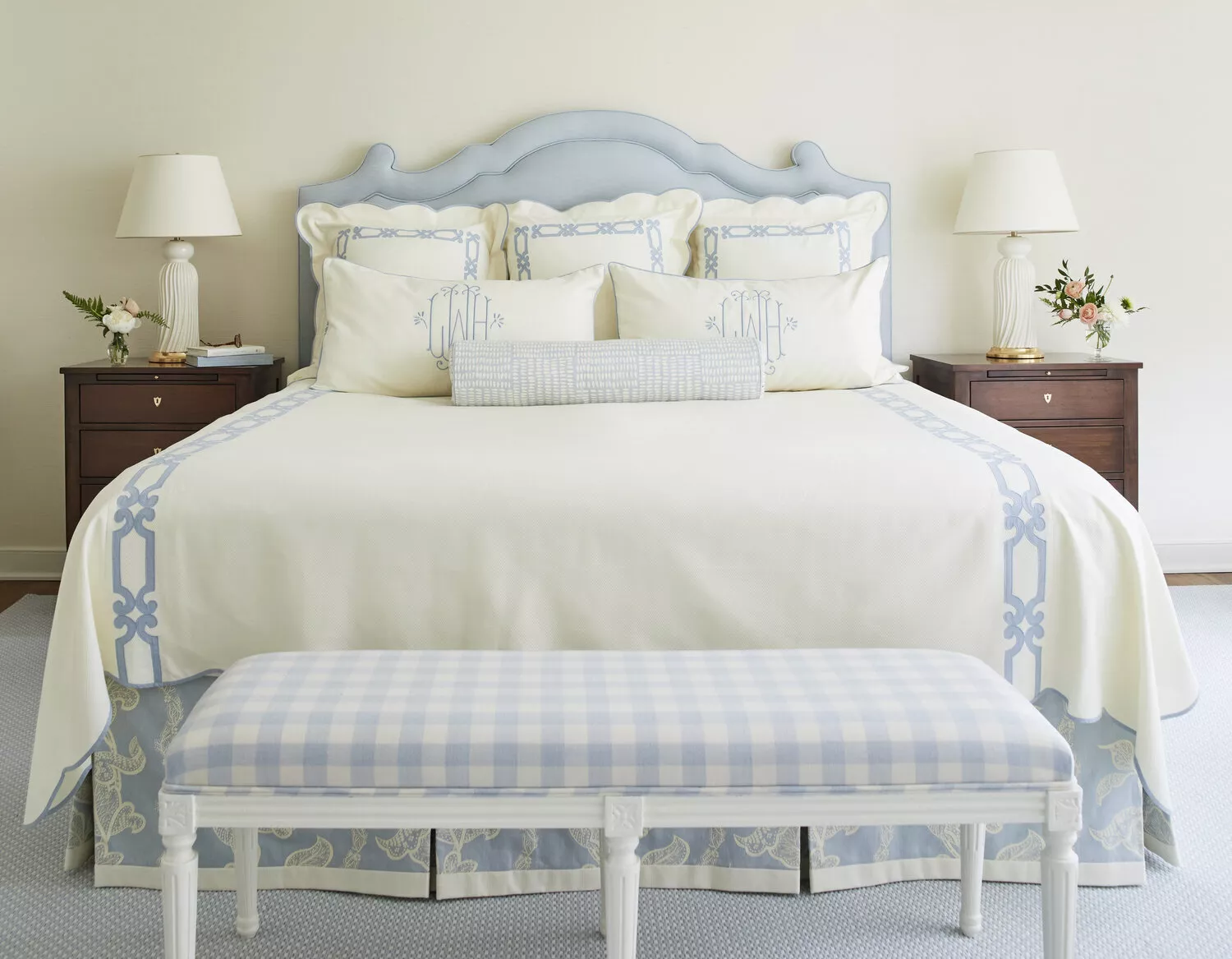 This ivory pique bed set features soft blue details to pull in the hues from the upholstered headboard and bench. The monogrammed shams feature subtle floral details that are offset by the curved geometric pattern of the applique Mitchell border, which frames both the Euro shams and the blanket cover.