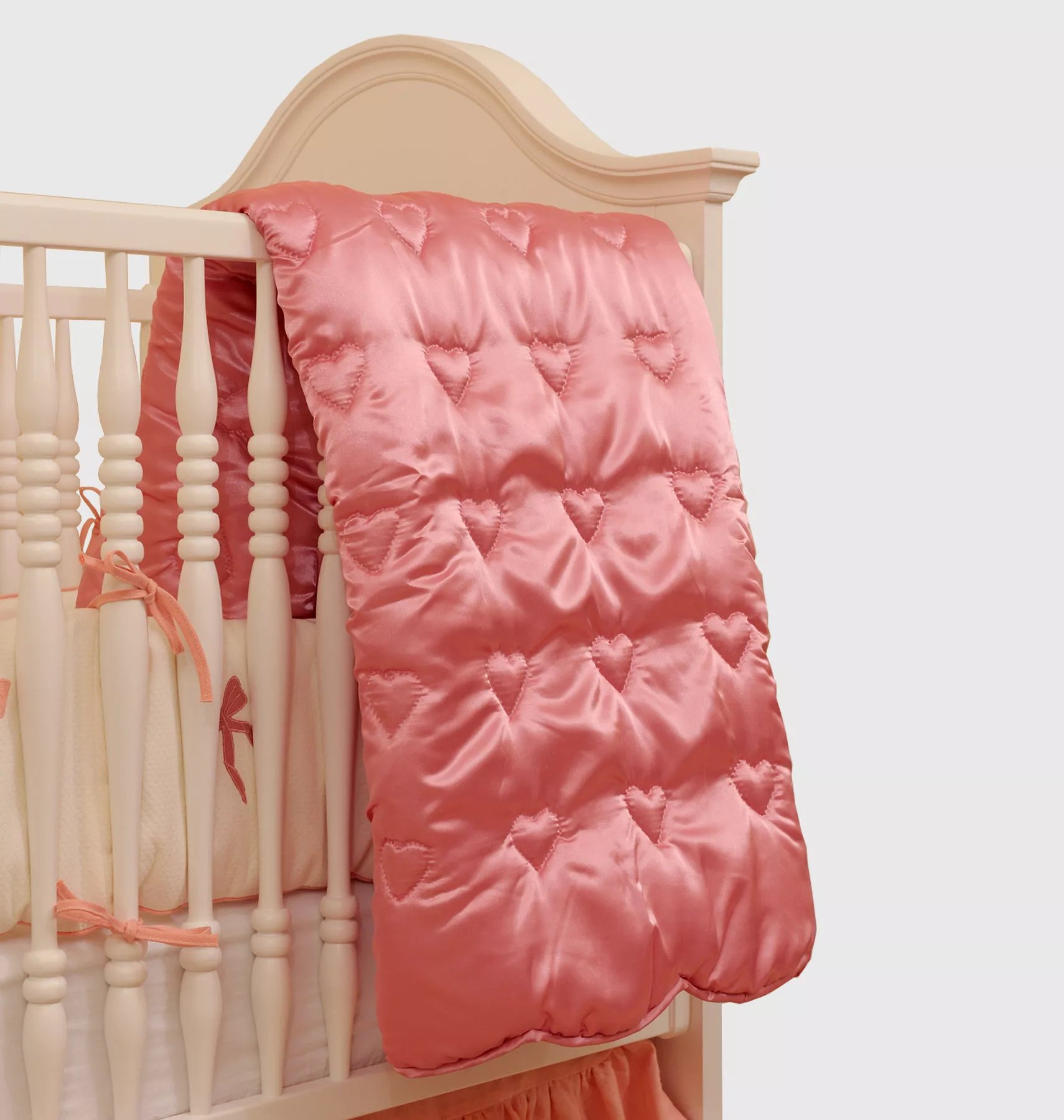 Help your little one drift sweetly into dreamland while wrapped in our Hearts crib quilt. Finished with a darling scallop edge, this is a soft and soothing addition to any crib setup.