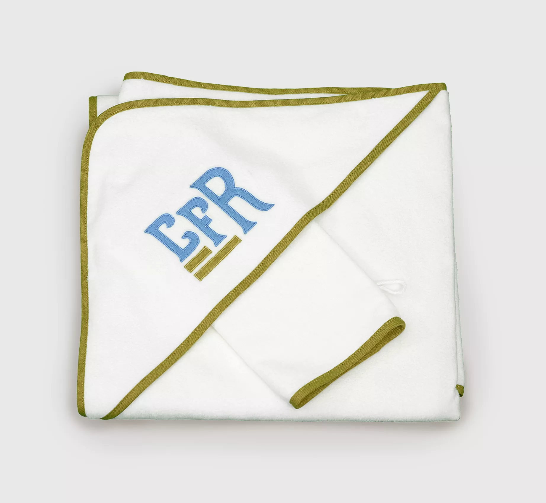The perfect monogrammed towel to keep baby warm and dry after a bath. The hooded towel also comes with a coordinating bath mit.