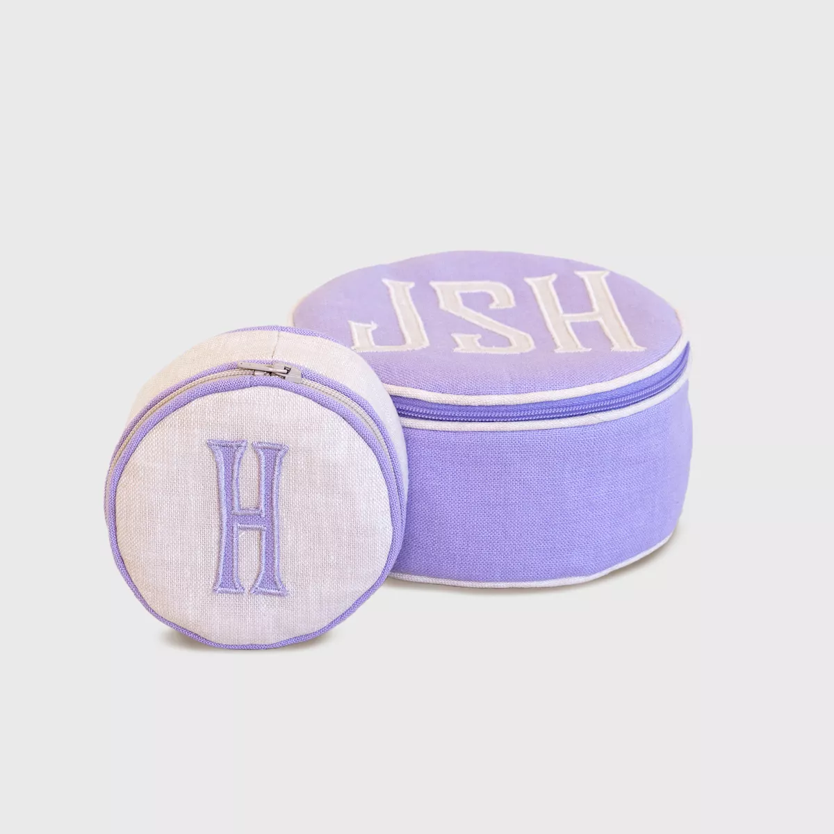 A chic and secure way to store your jewelry at home and when you're on the road. The set includes both the large and pearl round which can both be monogrammed. The small can only accommodate a single initial due to the dimensions.