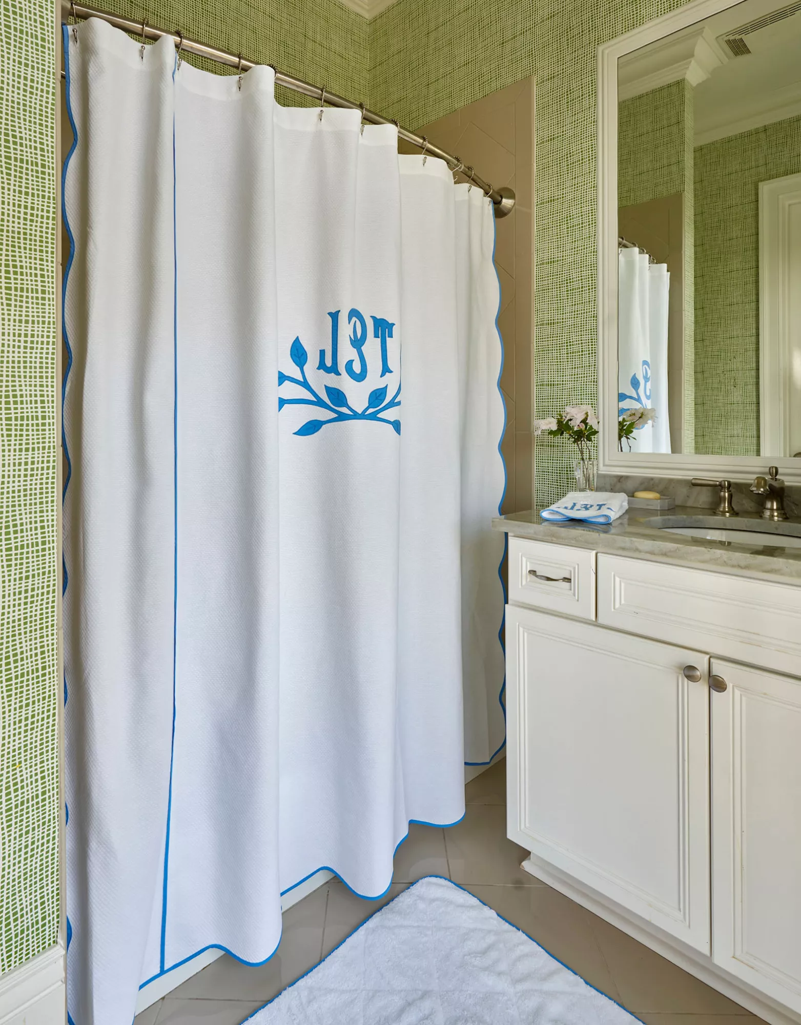 The feminine Juliette monogram and delicate piping on the pieces in this bright bathroom add touches of personalization and whimsy. A bright blue poplin was used for the monogram along with the scalloped detailing along the sides of the shower curtain and the piping found along the edges of the hand towel, bath mat, and inset within the curtain.