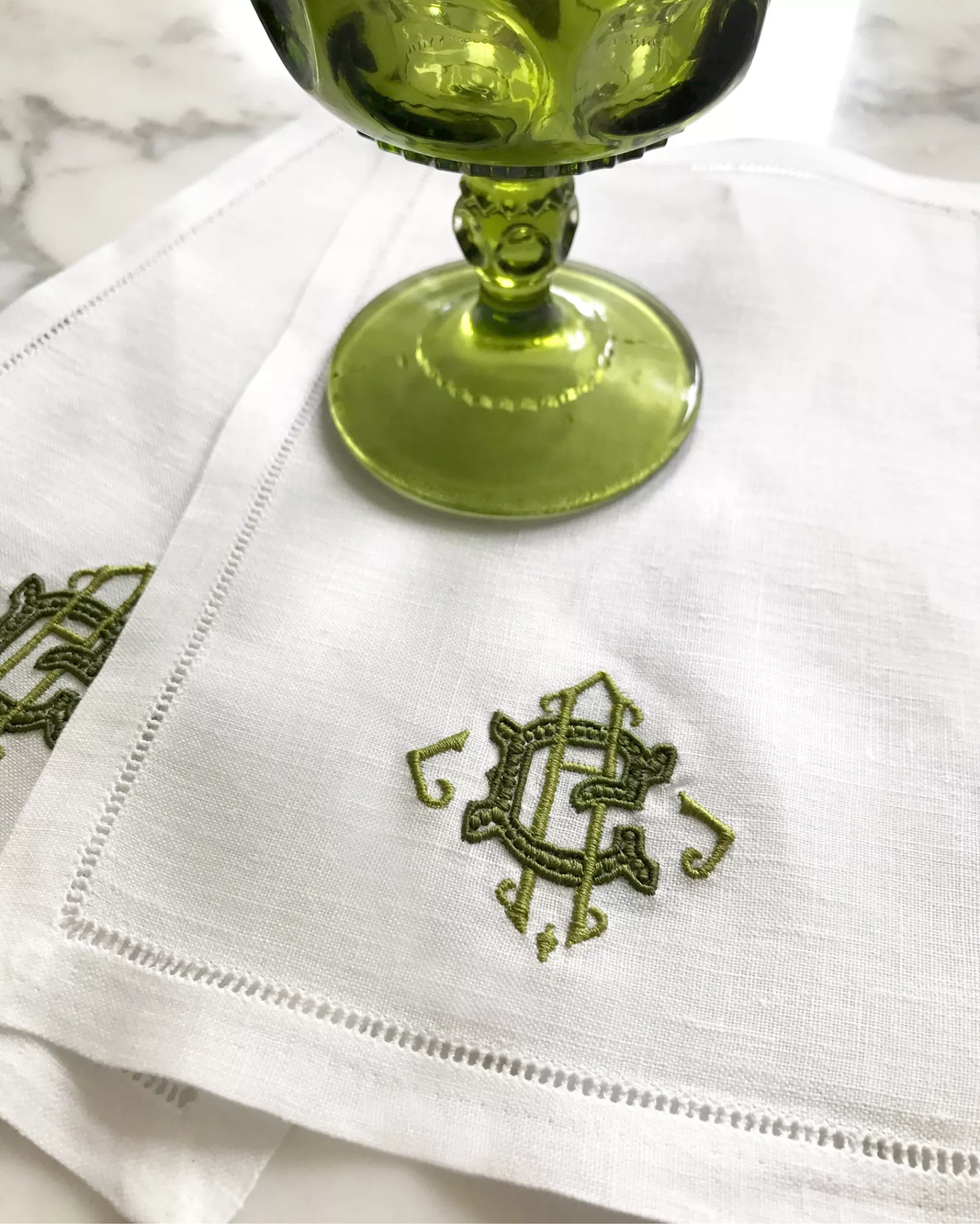 The Keith monogram features two initials stitched in complementary shades of green. This style is perfect for a his-and-hers cocktail napkin style sewn on the traditional hemstitch linen.
