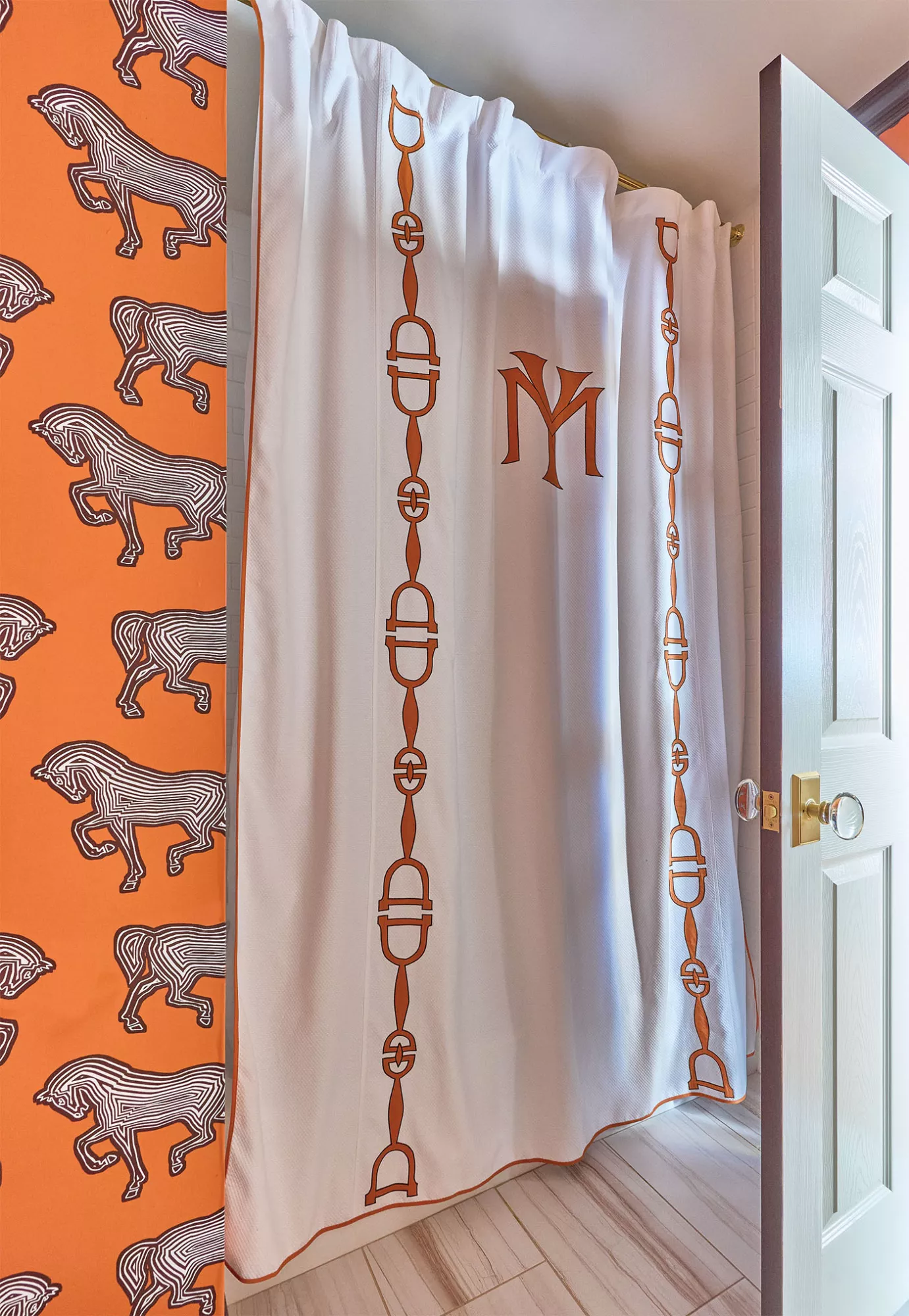 We cut and sew each shower curtain to measure so that it fits perfectly within your space. Here, this pique curtain hangs from a near-ceiling height rod and features the applique Horsebit border and Kinsey monogram, both of which are corded in brown corresponding with the Schumacher wallpaper. To complete the piece, a matching amber trim wraps around the three edges of the curtain.