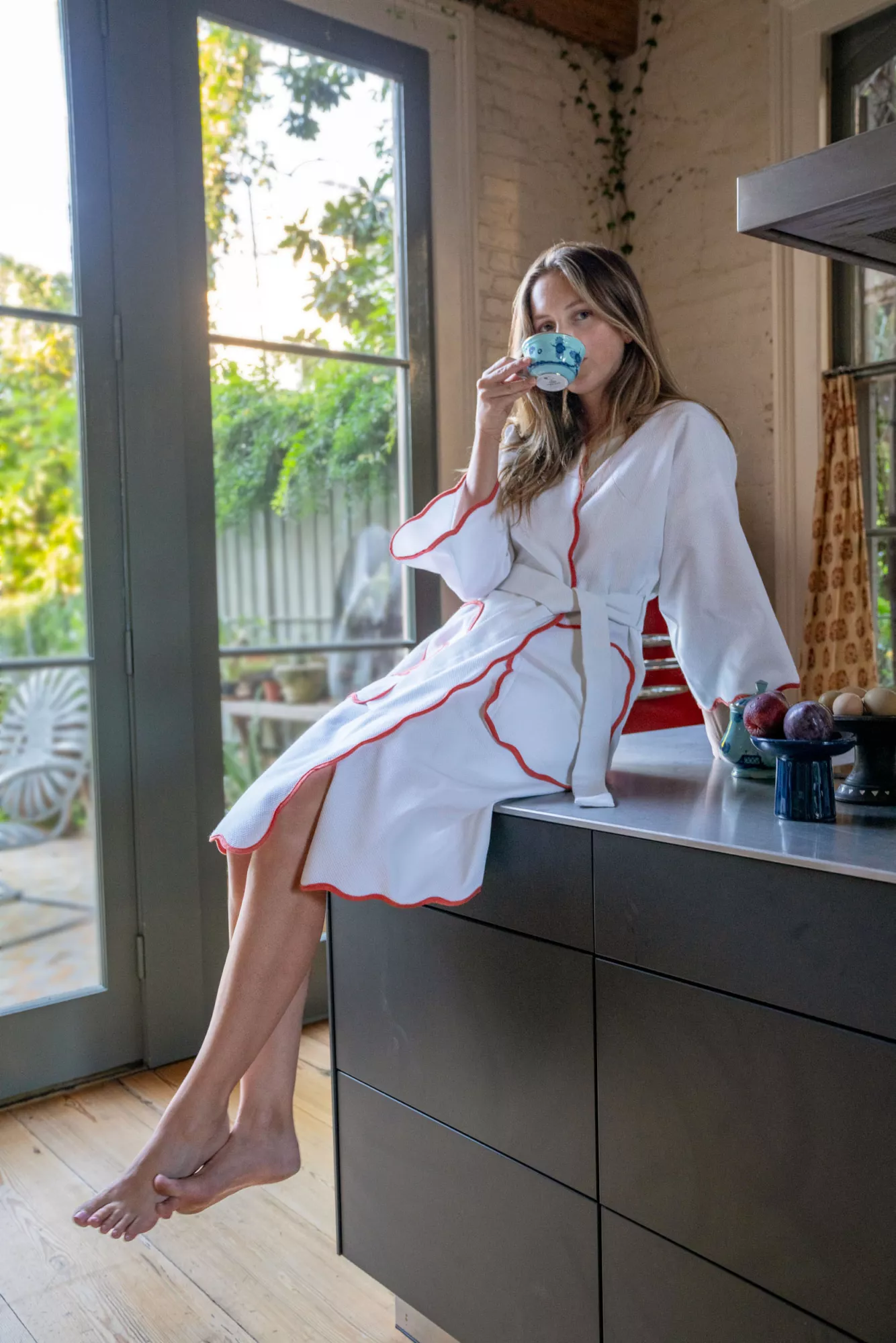 The Osaka robe features scalloping detail along the edge to add a touch of femininity to the kimono-style robe. All robe lengths can be customized to any length.