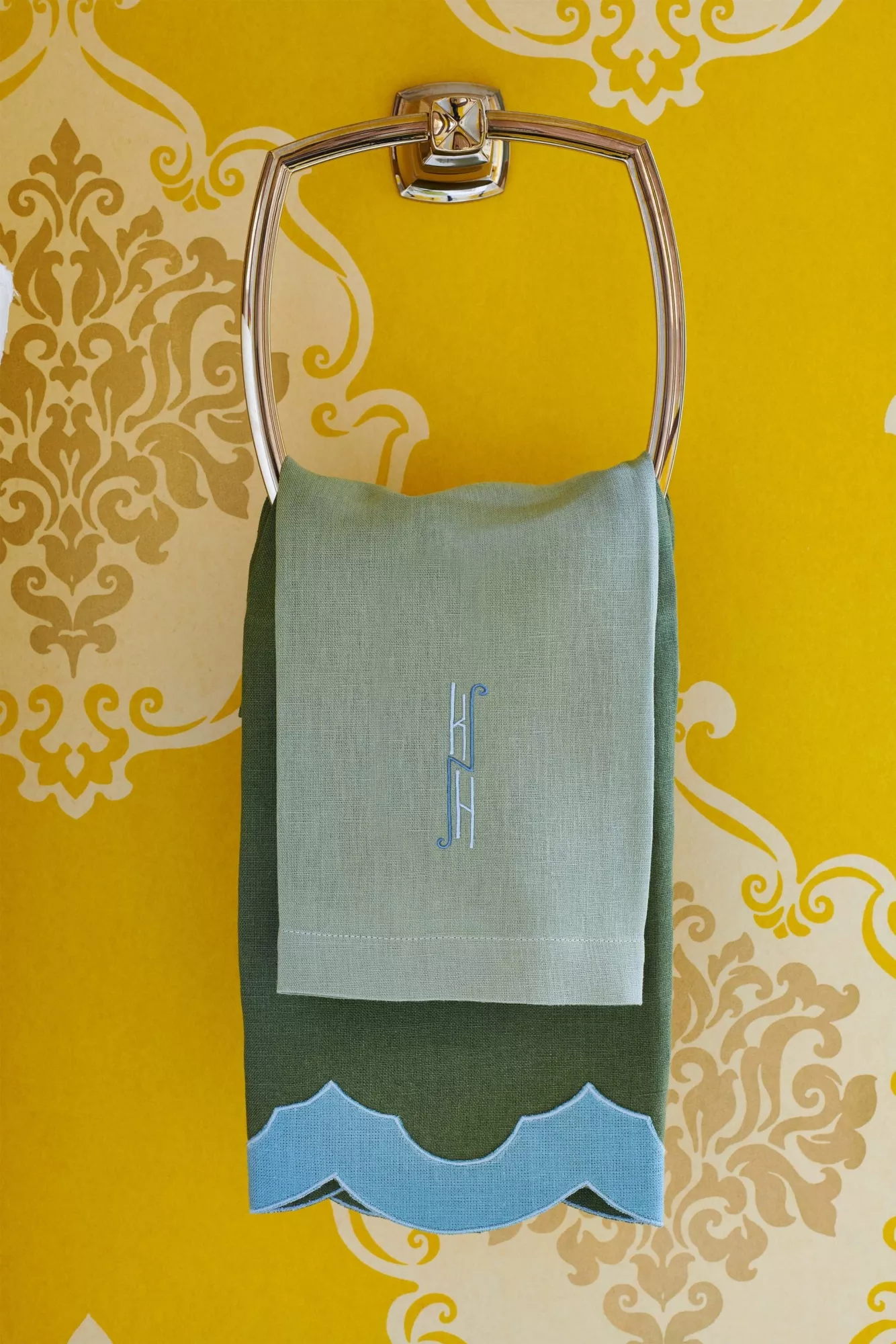 The larger towel in this set features deep green linen finished with the Webster applique border in a soft blue. This towel could easily work on its own, or be paired with a fingertip towel as seen here!