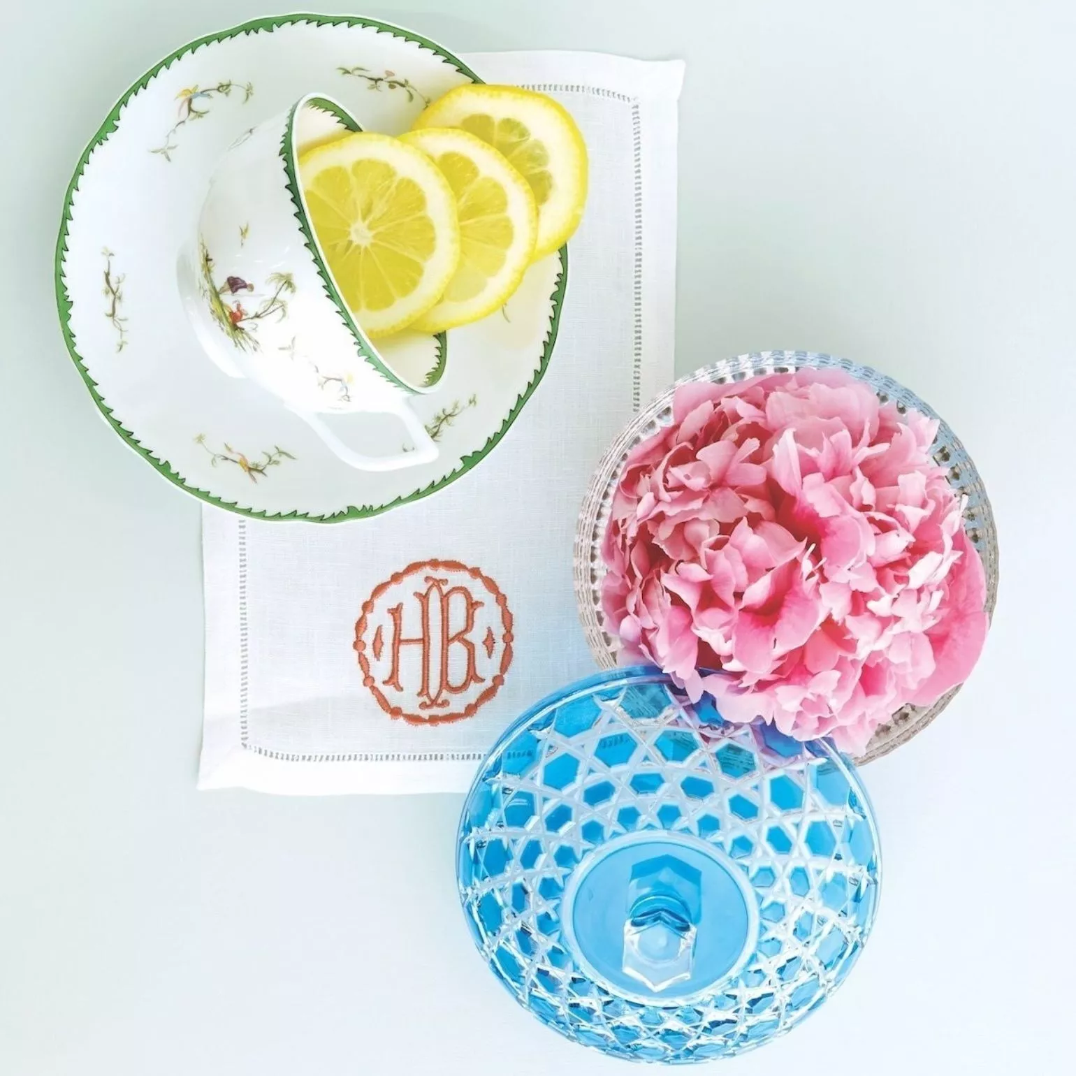 The classic white hemstitch cocktail napkin gets a bright refresh with the circular Riley monogram stitched in bright orange.
