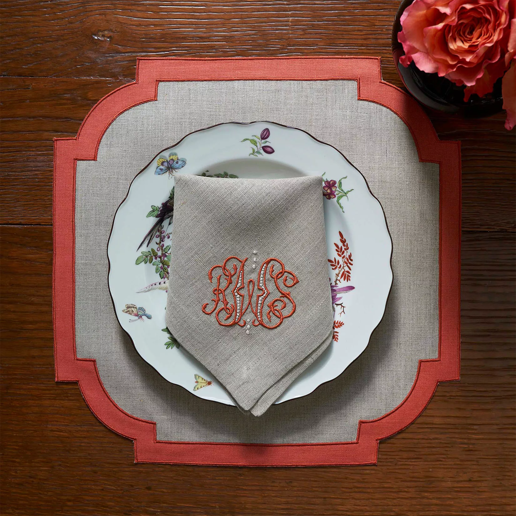 The Alexa monogram corresponds perfectly to the Santorini placemat with a combination of burnt orange embroidery delicately seeded with a touch of ivory. Shown on a a hemmed dinner napkin.