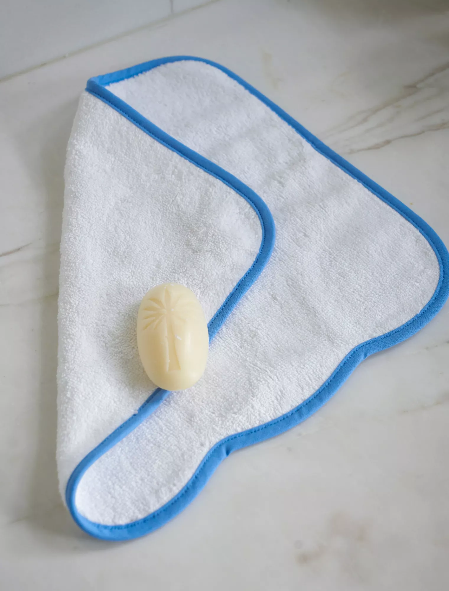 Style your vanity, or your guest bathroom to treat your overnight guests, with a set of wash cloths for every day use. For a pop of color, blue poplin trims the edges.