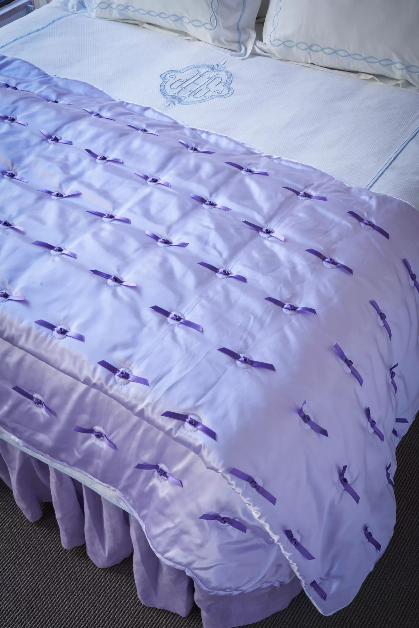 Hand-knotted satin bows add the perfect delicate touch to the Buttons Quilt. Select from an array of ribbons to complement your silky piece, whether you opt to match colors or choose a contrasting color to tie in the palette of the room, or pair your favorite hues together for a fun personalized quilt. This quilt can be finished in a straight or scalloped edge.