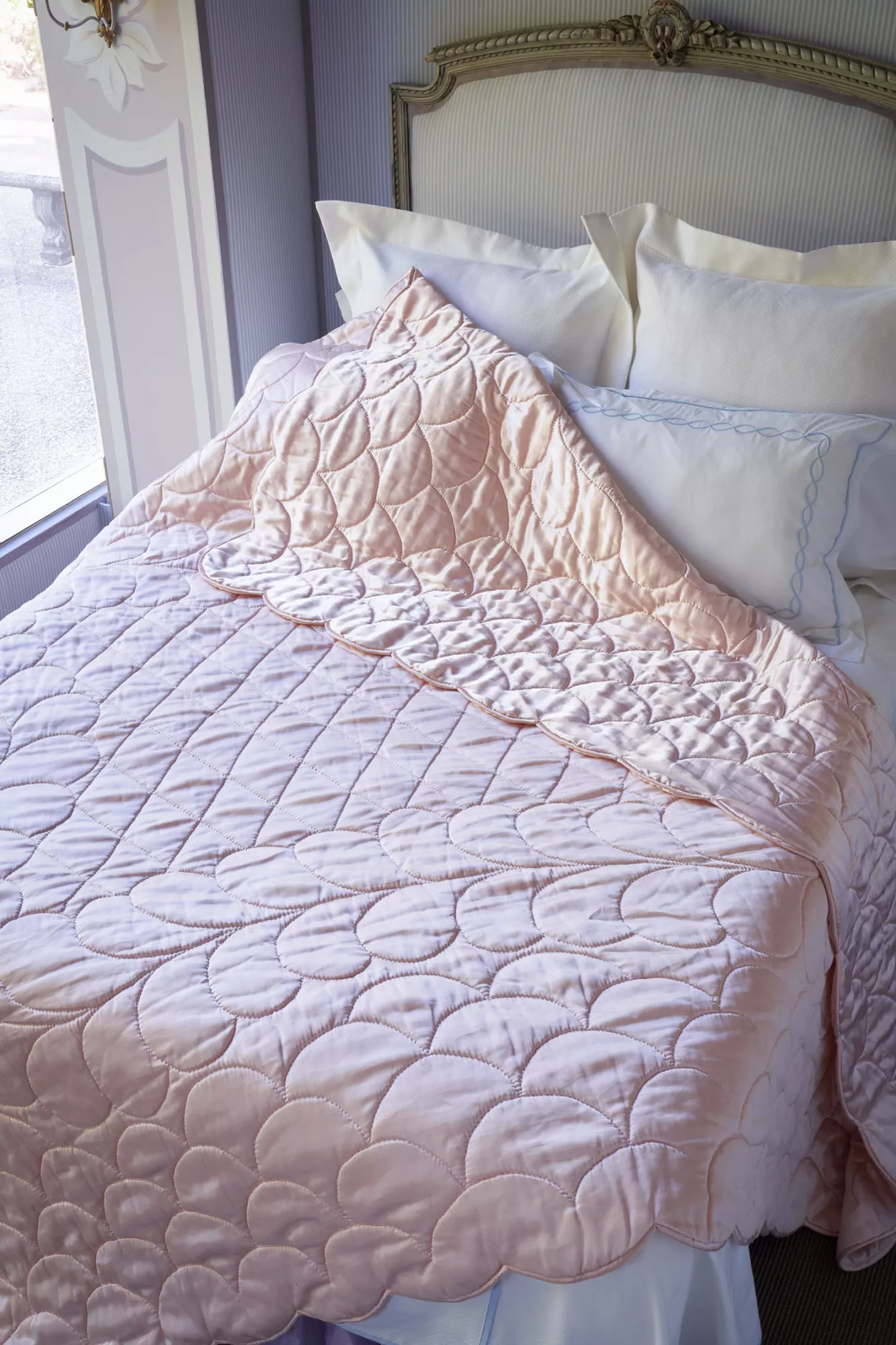 The softness of the Navarre Quilt pattern does not take away from the intricacy and expertise behind the hand-stitching of the pattern. Layer upon layer of scallops and brushstroke-like shapes weave a pattern around the perimeter of the design leading toward the lattice-patterned interior.