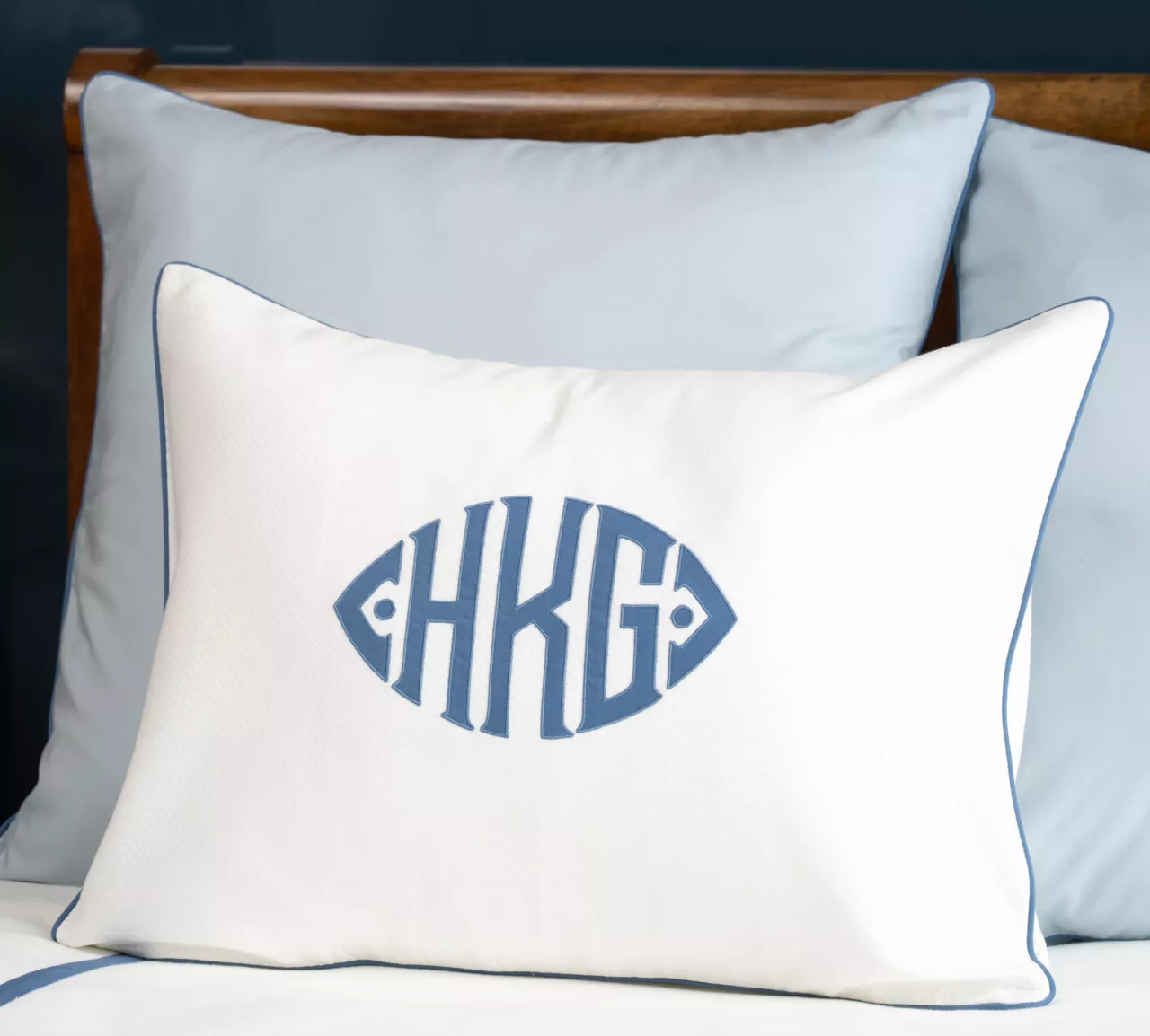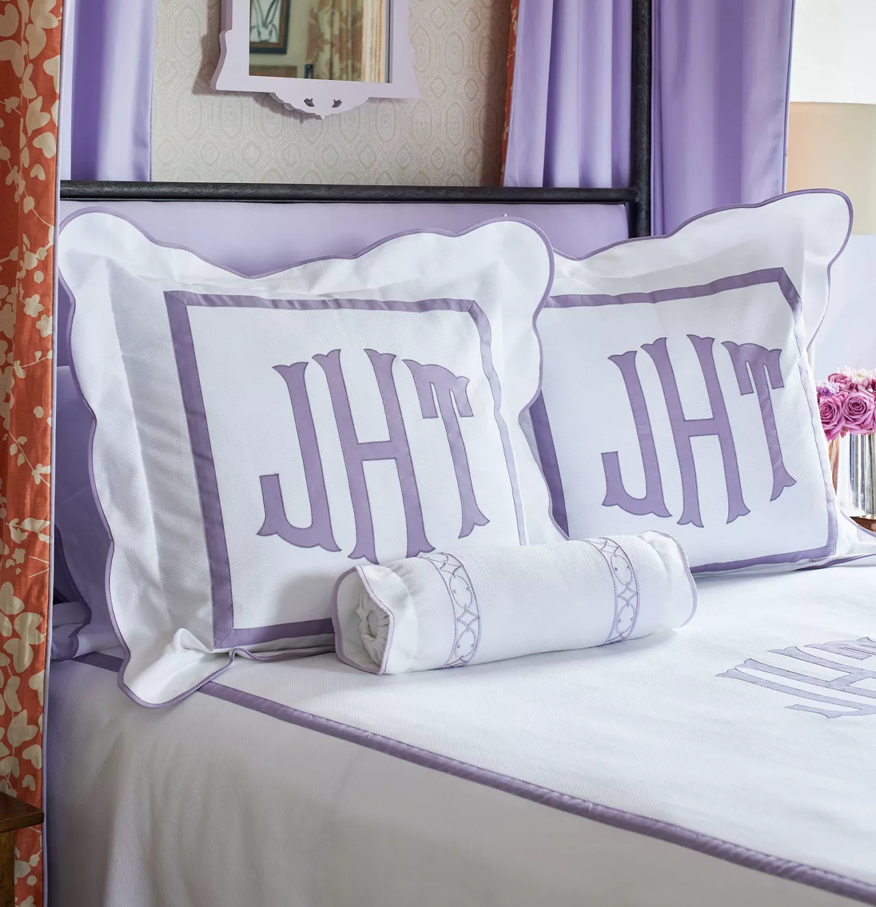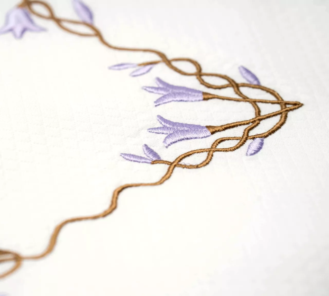A signature Eleanor Beard festoon treatment can be found along the outer edges of the Plume Quilt, just as it appears within the Cordelia and Fantasy designs. These delicate layers of scallops and points create the perfect frame for the inner design. For the Plume Quilt, a compact diamond lattice pattern is expertly stitched and forms a background for the feather-like motif, giving the quilt it's apt name: Plume.