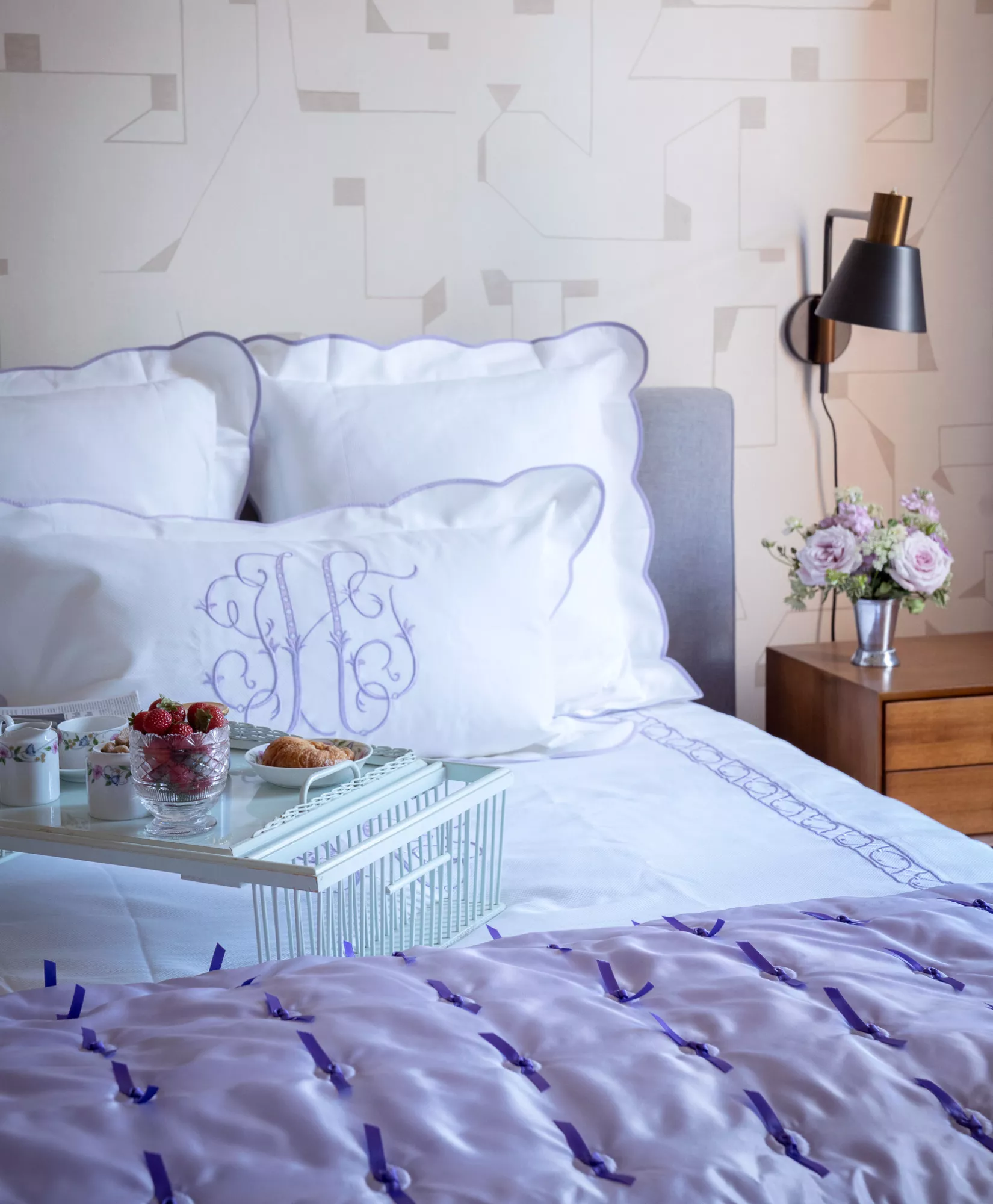 Lavender takes center stage in this bedroom, where modern and traditional styles blend. Against the geometric wallpaper sit elegantly monogrammed pillows featuring the Addison monogram, the Vesta embroidered border cascading down the sides of the blanket cover, and a satin monochromatic quilt as the pièce de résistance.